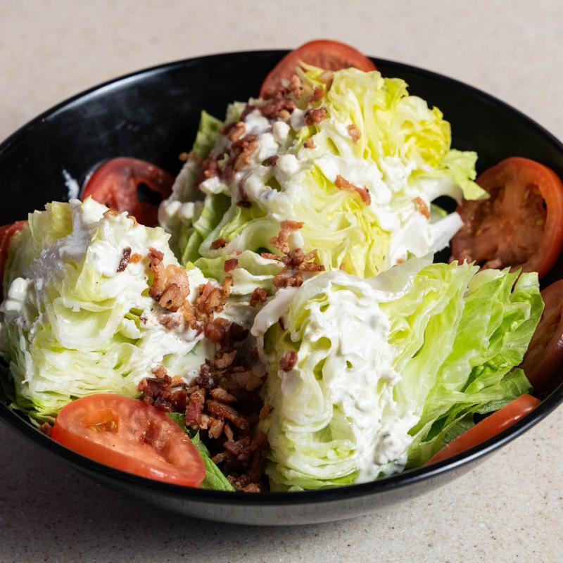 Small head of baby lettuce topped with blue cheese dressing, bacon and sliced tomatoes.