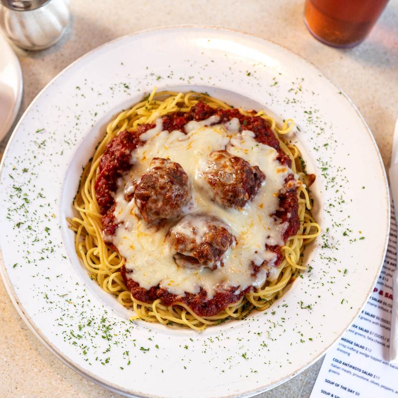 Amedeo's homemade meat sauce and meaballs, baked with shredded mozzarella cheese and pasta.