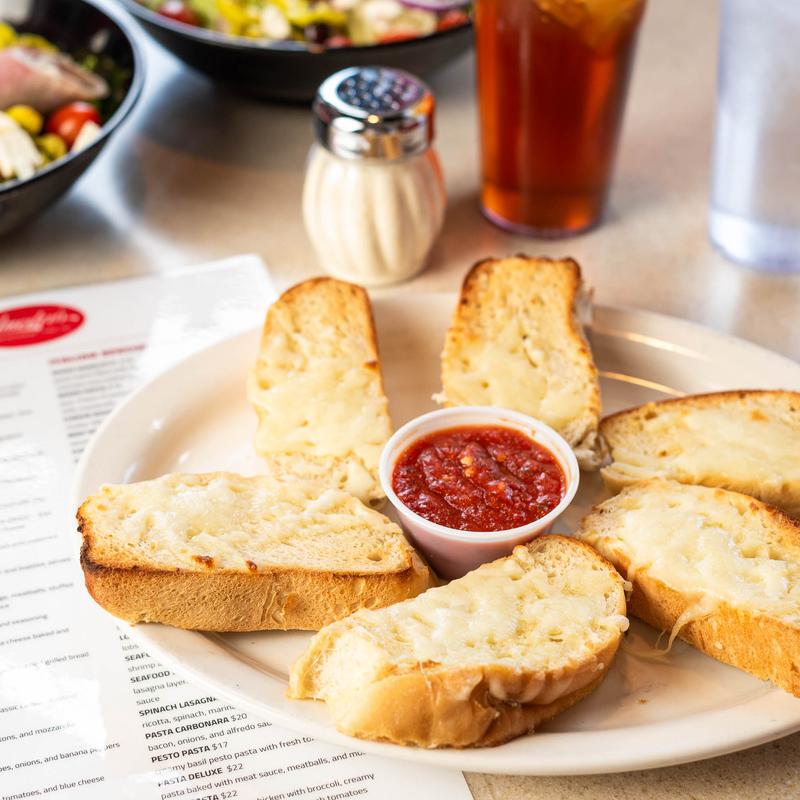 Slices of our homemade Italian artisan bread covered with a garlic butter sauce and melted mozzarella cheese. Served with a side of homemade marinara.