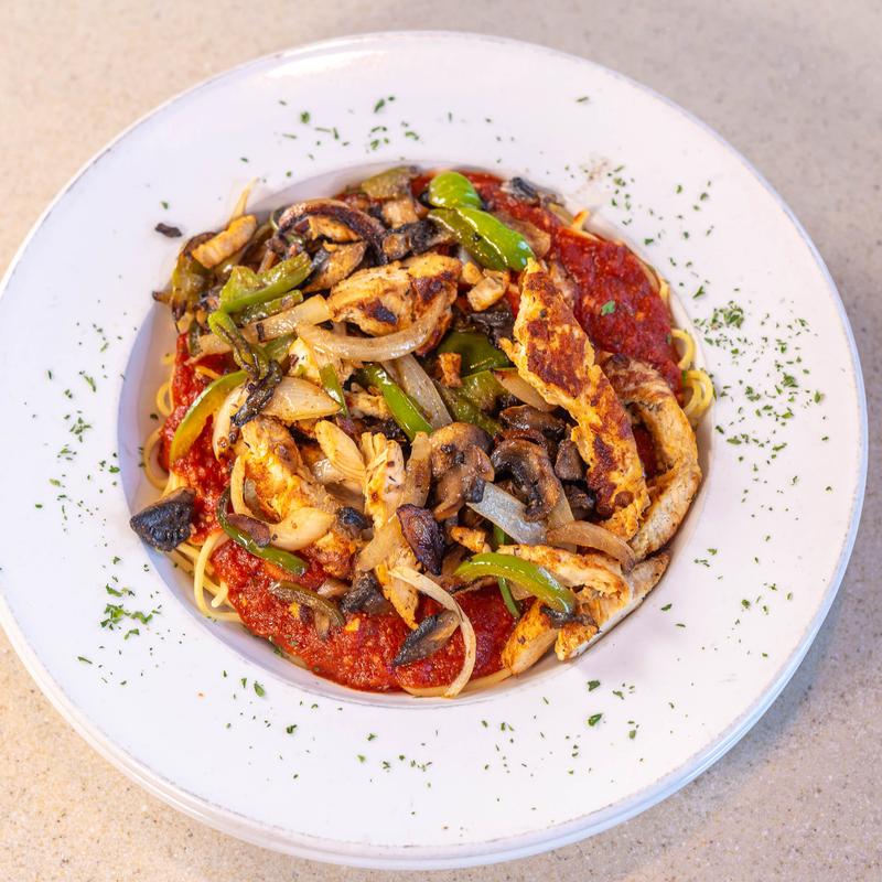 A bed of spaghetti with our homemade marinara, grilled green peppers, mushrooms and onions. Topped with grilled chicken | Substitute shrimp or add shrimp