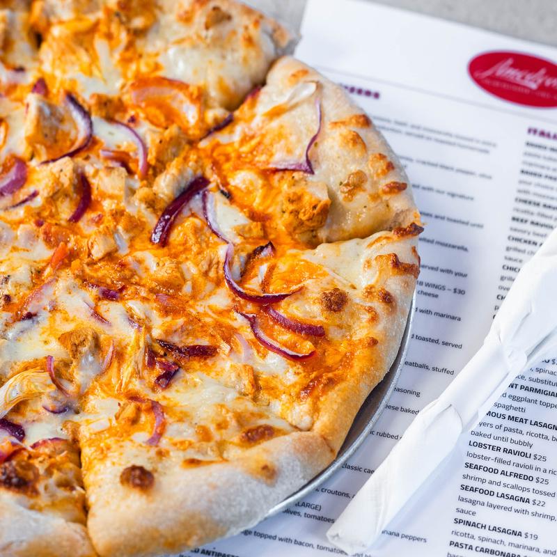 Chicken breast, buffalo sauce, mozzarella, homemade ranch and red onions.