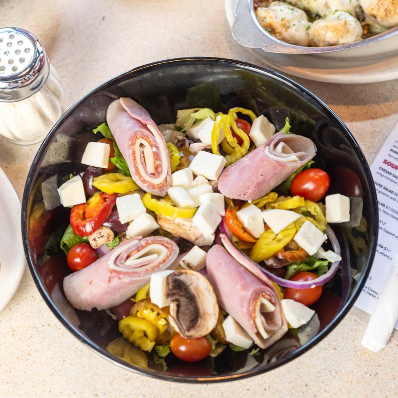 Slices of ham, salami, provolone, green and black olives, onions, tomatoes, cherry peppers, roasted red peppers and banana peppers topped with mozzarella cheese. All over a bed of mixed greens | Add anchovies