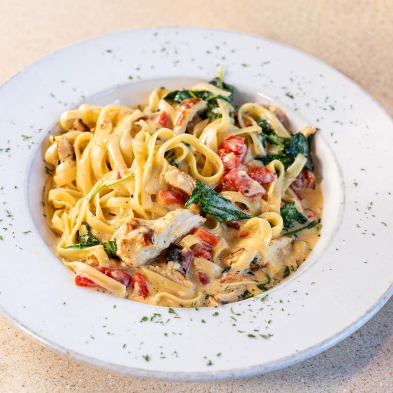 Grilled chicken sautéed in olive oil, roasted peppers, spinach and garlic Alfredo sauce, all mixed with pasta of your choice | Add shrimp